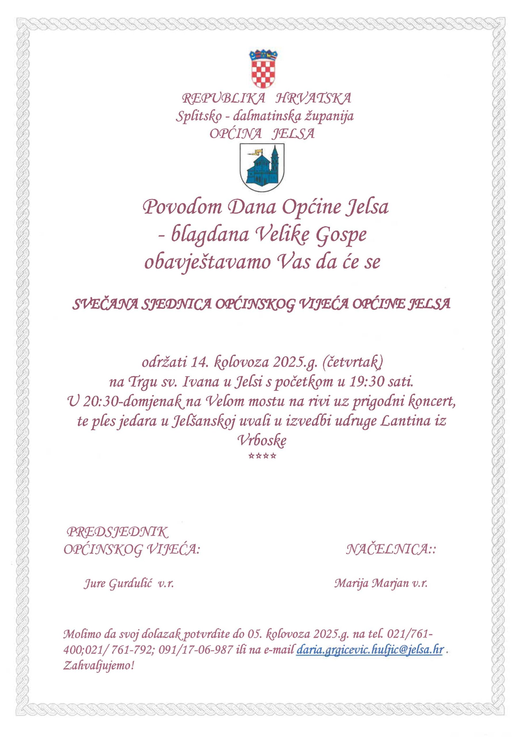 Poziv na svečanu sjednicu Općinskog vijeća Općine Jelsa